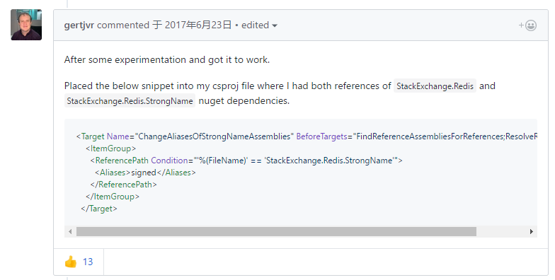 错误提示的大意为,StackExchange.Redis.dll 和 StackExchange.Redis.StrongName.dll 中都存在 StackExchange.Redis 命名空间,且命名空间下都有一个 ConnectionMultiplexer 类型,先不追究同事为何需要同时使用这样两个程序集,假设这是必要的,我们来尝试解决这个问题。