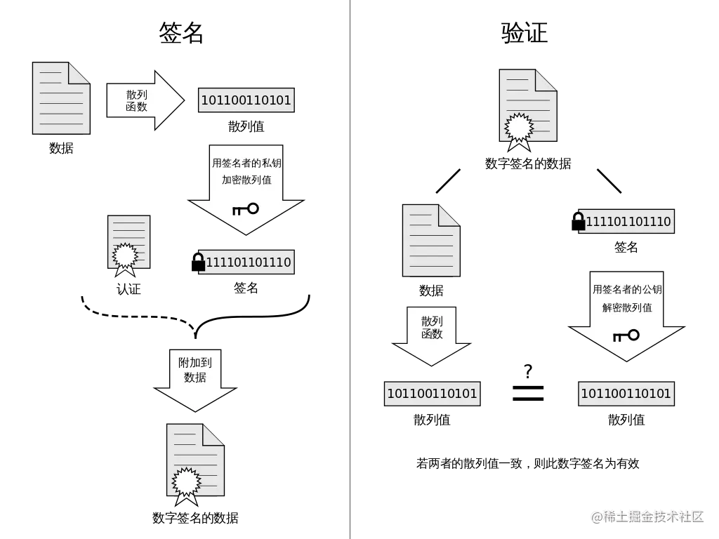 注意 :图中 加密过程 有别于 公钥加密 ,更多 介绍戳这里。签名 最根本的用途是要能够唯一 证明发送方的身份 ,防止 中间人攻击 、